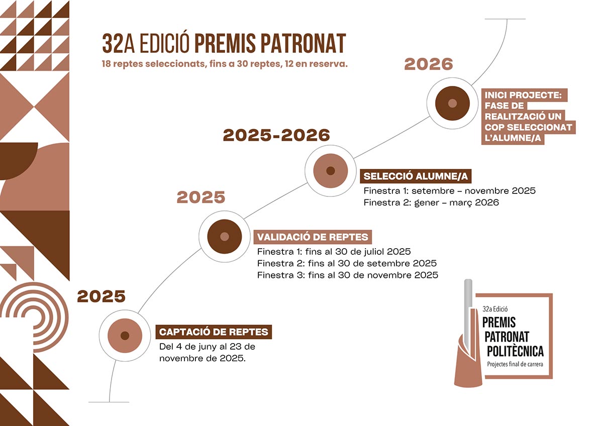 Durant el curs 2025/26 hi haurà convocada la 32a edició dels Premis Patronat, que volem que esdevingui una palanca de creixement, de canvi i d’oportunitats, entre el talent de la Politècnica UdG, els reptes de les empreses i entitats del Patronat Politècnica i els tutors implicats en el projecte.