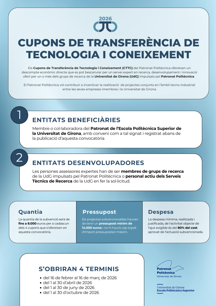 Els cupons de Transferència de Tecnologia i Coneixement (CTTC) del Patronat Politècnica ofereixen un descompte econòmic directe que es pot bescanviar per un servei expert en recerca, desenvolupament i innovació ofert per un o més dels grups de recerca de la Universitat de Girona (UdG) impulsats pel Patronat Politècnica.